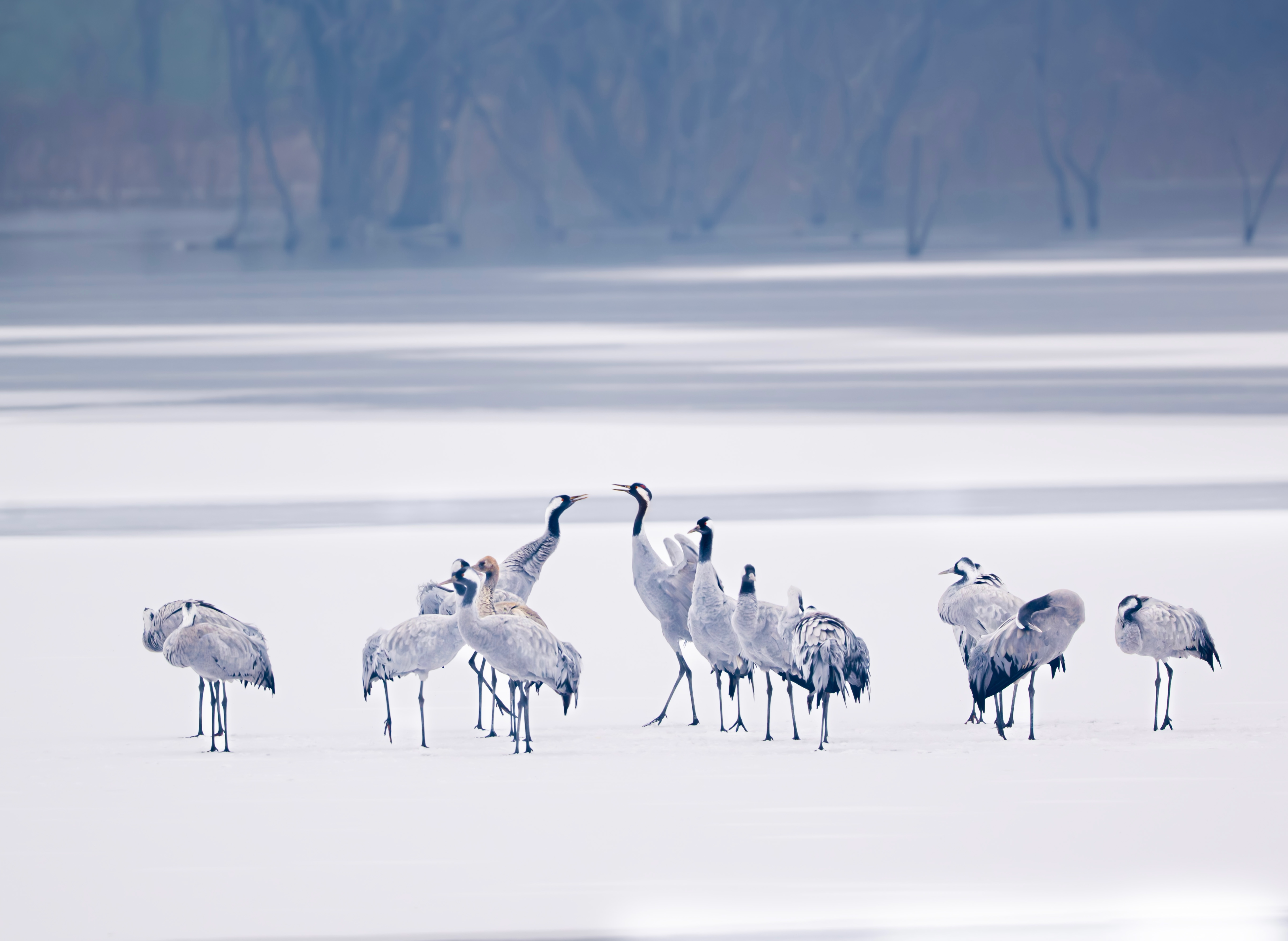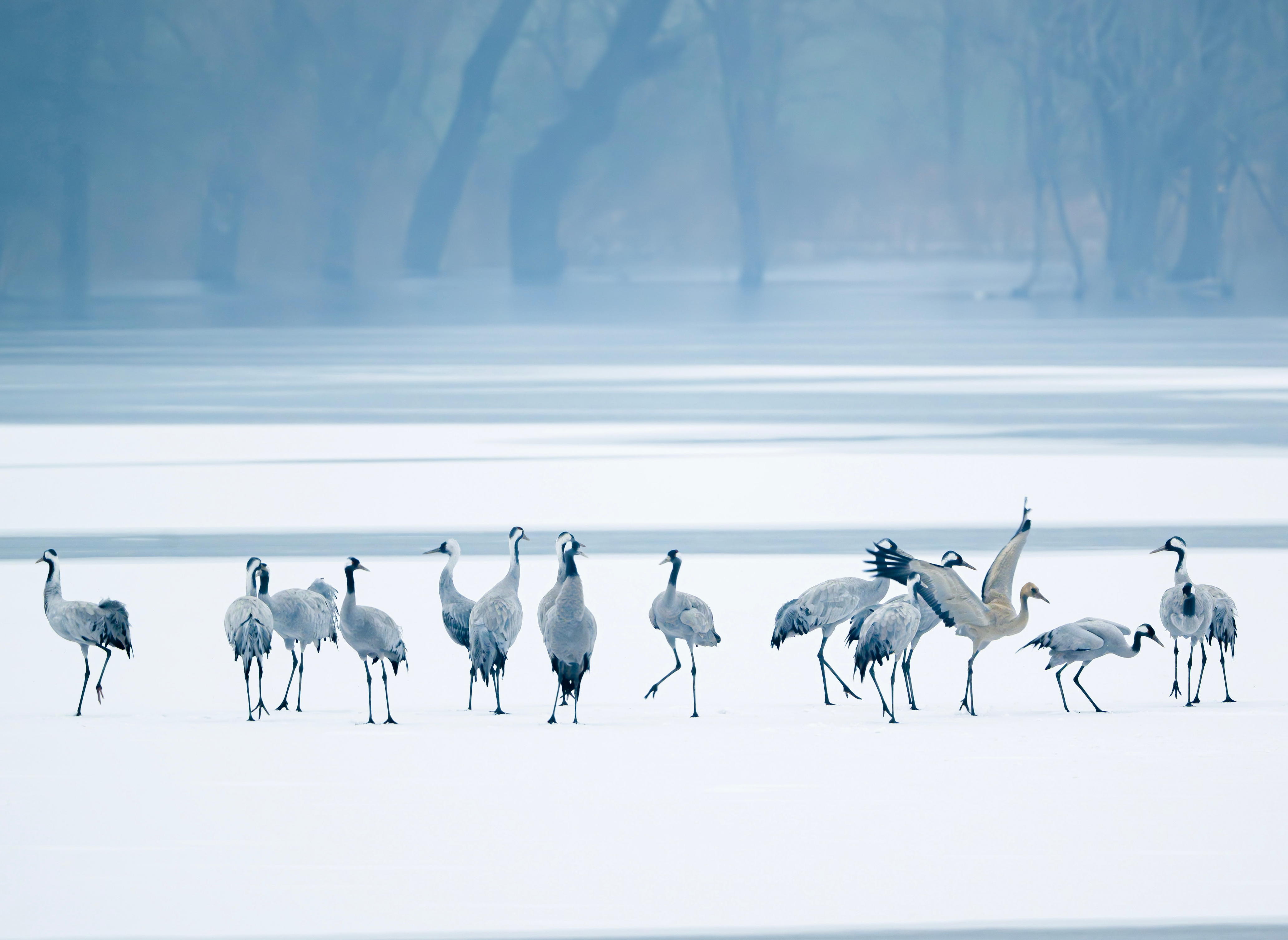 Recentemente, 16 grous-cinzentos, espécie protegida de Classe II na China, foram avistados sobre a superfície gelada e coberta de neve do reservatório de Tangzhishan, no distrito de Shunyi, em Beijing. As elegantes figuras das aves contrastavam de forma encantadora com o gelo e a neve, compondo uma imagem fascinante.